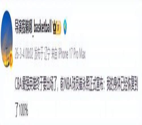 根據著名媒體人導演我躺哪報道,這位曾在NBA夏季聯賽嶄露頭角的年輕鋒線,通過個人社交媒體正式宣布:“我的身體已經恢復到了100%?!倍潭桃痪湓?,就像一顆投入湖面的巨石,瞬間在籃球圈激起千層浪。而更讓球迷熱血沸騰的是,他的復出首秀,就要對陣聯賽中的勁旅新疆隊。