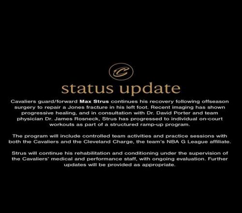 接下來(lái)他將逐漸開(kāi)始與球隊(duì)合練,可能在騎士和下屬發(fā)展聯(lián)盟球隊(duì)進(jìn)行訓(xùn)練。斯特魯斯將在醫(yī)療和訓(xùn)練團(tuán)隊(duì)的監(jiān)督下繼續(xù)進(jìn)行康復(fù)訓(xùn)練,后續(xù)將跟進(jìn)其動(dòng)態(tài)。