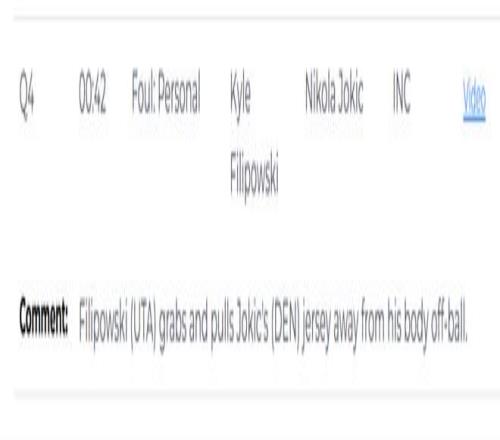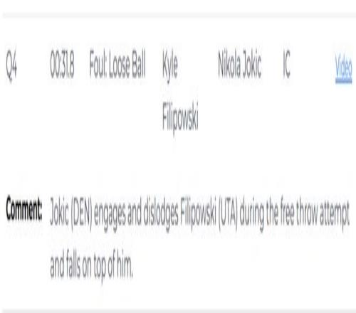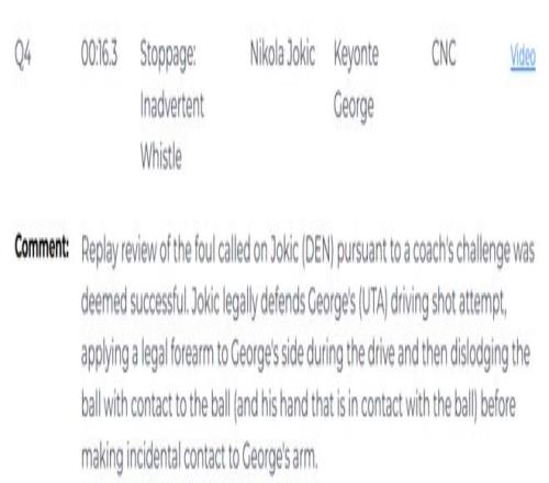 第二次是錯(cuò)判,終場前31.8秒,穆雷執(zhí)行罰球,約基奇與菲利波夫斯基發(fā)生身體接觸并將其推開,隨后壓在對方身上。裁判當(dāng)時(shí)吹罰了菲利波夫斯基無球爭搶犯規(guī),給了約基奇一次罰球機(jī)會。但裁判報(bào)告顯示,這個(gè)吹罰是一次錯(cuò)判,本該吹約基奇犯規(guī)。由于約基奇當(dāng)時(shí)已經(jīng)身背5次犯規(guī),如果裁判吹罰正確,他本該被罰下。這次錯(cuò)判爵士吃虧,掘金獲利。