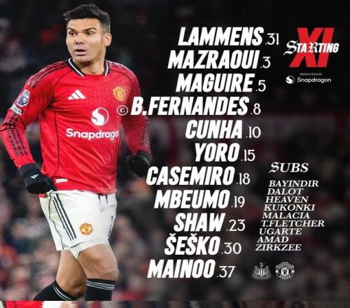 曼聯首發:31-拉門斯、3-馬茲拉維、5-馬奎爾、15-約羅、23-盧克-肖、18-卡塞米羅、37-梅努、8-布魯諾-費爾南德斯、10-馬特烏斯-庫尼亞、19-姆伯莫、30-謝什科