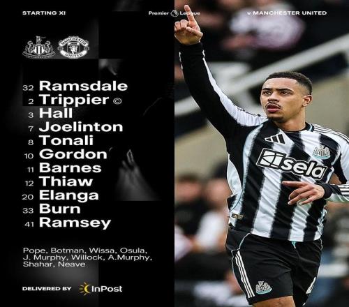 紐卡斯爾聯首發:32-拉姆斯代爾、2-特里皮爾、33-丹-伯恩、12-馬利克-佳夫、3-劉易斯-霍爾、7-喬林頓、8-托納利、41-雅各布-拉姆齊、10-安東尼-戈登、11-哈維-巴恩斯、20-埃蘭加