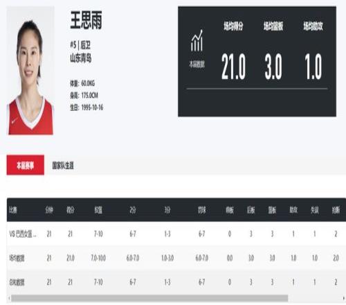 此役王思雨全場比賽替補20分鐘,10中7,三分3中1,罰球7中6,拿到21分3籃板1助攻2搶斷僅1失誤,命中率70%,她的個人表現(xiàn)比多位年輕核心更出色。