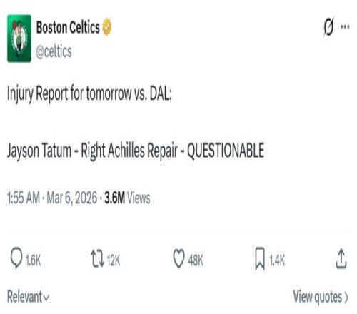 凱爾特人官方也第一時間更新公布球隊傷病狀況,塔圖姆的狀態從缺陣升級為出戰成疑。