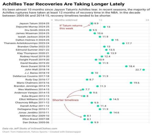 按照《雅虎體育》記者Tom Haberstroh的統計,聯盟過去10年球星跟腱撕裂(斷裂)傷病的休息時間平均約為13個月。