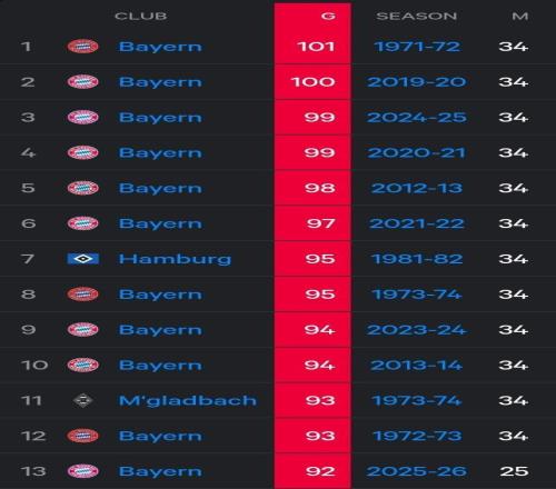 13、拜仁 92球 2025-26賽季