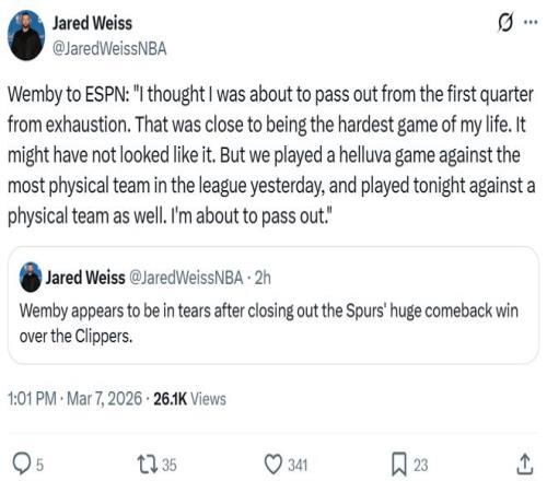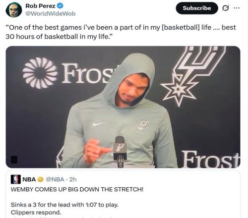 雖然只是一場常規賽,但能夠完成如此夸張的大逆轉,對手還是昔日核心小卡帶領的快船,賽后馬刺球員十分激動,全員瘋狂慶祝,文班更是直接抱著隊友喜極而泣。