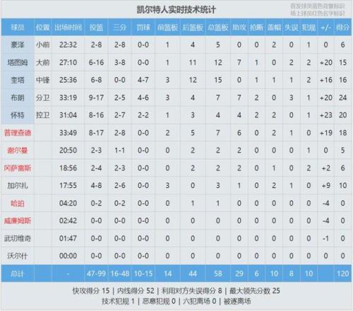 第三節塔圖姆找回信心,突破上籃+急停跳投,一個人連得7分。凱爾特人第三節再得32分,分差也來到兩位數。三節戰罷,凱爾特人90-80領先10分。第四節獨行俠進攻斷電,凱爾特人轟出一波13-0,分差來到20+,沒有懸念了。