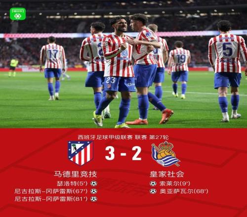 北京時間3月8日1:30,西甲第27輪繼續進行,馬德里競技坐鎮利雅得航空大都會球場迎戰皇家社會,本場主裁判為科爾德羅。上半場,瑟洛特凌空墊射破舊主,索萊爾推射閃電扳平。下半場,格列茲曼腳后跟助攻尼古拉斯-岡薩雷斯破門,奧亞薩瓦爾勁射閃電扳平,緊接著尼古拉斯-岡薩雷斯甩頭制勝梅開二度。最終,馬競3-2擊敗皇家社會。