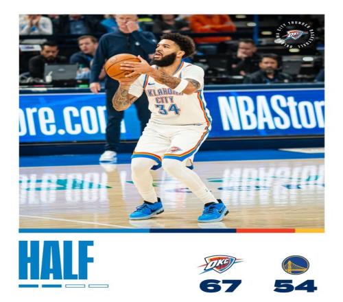 雷霆隊的K-威廉姆斯上半場得到13分,亞歷山大得到12分,喬得到10分;勇士隊的桑托斯得到14分和6個籃板,波杰姆斯基得到10分。