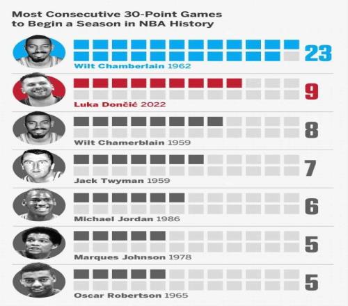 另外張伯倫還曾開季連續23場比賽砍下30+,最接近的人是盧卡·東契奇,他連續做到過9場。