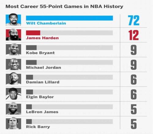 除了人們熟知的單場100分,張伯倫還曾在72場比賽里至少得到55分,歷史第二的哈登只有12場。