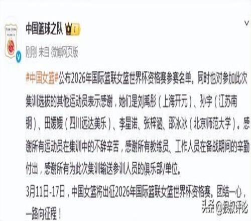公布2026年國際籃聯女籃世界杯資格賽參賽名單。同時也對參加此次集訓選拔的其他運動員表示感謝,她們是劉禹彤(上海開元)、孫宇(江蘇南鋼)、田媛媛(四川遠達美樂)、李星諾、張梓涵、邵冰冰(北京師范大學)。感謝所有運動員在集訓中的不辭辛苦,感謝所有教練員、工作人員在備戰期間的辛勤付出,感謝所有為此次集訓輸送參訓人員的俱樂部/單位。