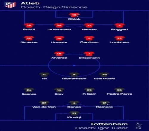 馬競vs熱刺:格列茲曼、阿爾瓦雷斯首發,里沙利松、特爾出戰 懂球帝 2026-03-11 08:22:21 北京時間3月11日4:00,歐冠1/8決賽首回合,馬德里競技坐鎮利雅得航空大都會球場迎戰托特納姆熱刺,本場主裁判為格祖比尤克,賽前雙方首發出爐。【上咪咕獨家看英超】馬競免費觀看_熱刺隊免費觀看_格列茲曼免費觀看_馬競高清在線_熱刺隊高清在線_格列茲曼高清在線 馬競 熱刺隊 格列茲曼 里沙利松 馬德里競技 馬蒂斯·特爾 安東尼·格里茲曼 拉薩羅·阿爾瓦雷斯 上一篇: 沃特金斯談對切爾西的進球被判越位:那越位線畫得真的很苛刻 下一篇: 本賽季24次上半場沒進球,為利物浦自202021賽季以來最多