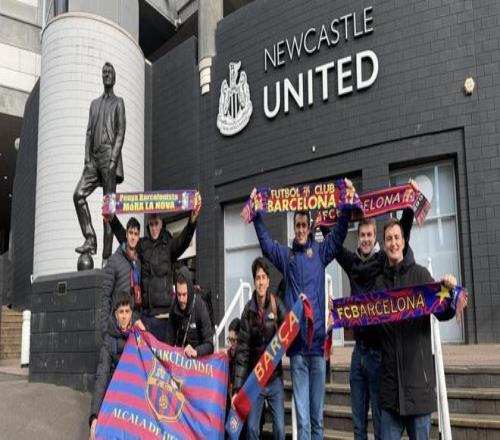 報道稱,巴薩球迷前往紐卡斯?fàn)栔С指ダ锟说那蜿?duì)沖擊歐冠八強(qiáng),他們在圣詹姆斯公園球場外的博比-羅布森爵士與阿蘭-希勒雕像前紛紛合影留念。