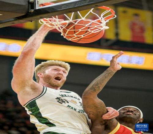 3月11日,南京天之藍隊球員馬內克(左)在比賽中扣籃。新華社記者 江漢 攝